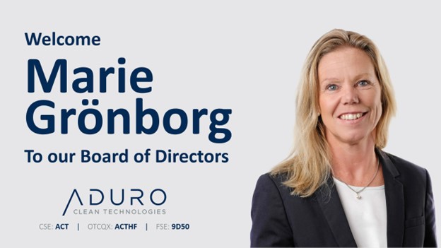 SARNIA, Province de l’Ontario, 09 nov. 2023 (GLOBE NEWSWIRE) -- ci-après Aduro Clean Technologies Inc. (« Aduro » ou la « Société ») (CSE : ACT) (OTCQX : ACTHF) (FSE : 9D50), un développeur canadien de technologies brevetées basées sur l’eau pour recycler chimiquement les plastiques et transformer le pétrole brut lourd et les huiles renouvelables en matières premières et en carburants de plus grande valeur, a le plaisir d’annoncer la nomination de Marie Grönborg en tant que membre du conseil d’administration de la Société.