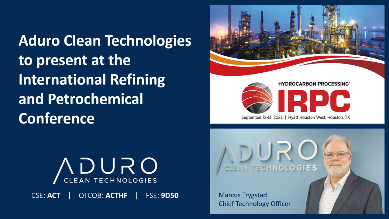 SARNIA, Ontario, 08 sept. 2023 (GLOBE NEWSWIRE) -- Aduro Clean Technologies Inc. (« Aduro » ou la « Société ») (CSE : ACT) (OTCQB : ACTHF) (FSE : 9D50), une société technologique canadienne utilisant le pouvoir de la chimie pour transformer les matières premières de plus faible valeur, comme les déchets de plastique, le bitume lourd et les huiles renouvelables, en ressources pour le XXIe siècle, a le plaisir d'annoncer que Marcus Trygstad, son directeur technologique, réalisera une présentation lors de l'International Refining and Petrochemical Conference (« IRPC »).