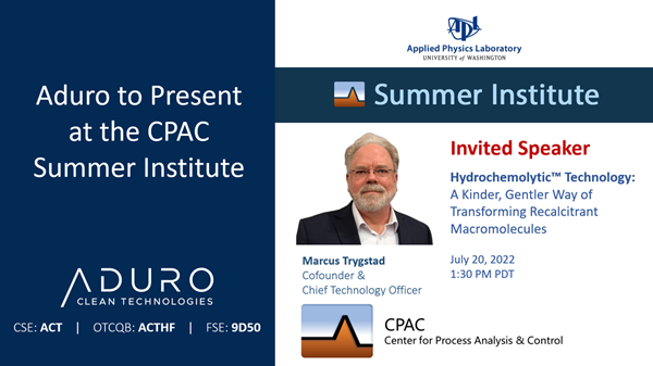 SARNIA, Ontario, 20 juill. 2022 (GLOBE NEWSWIRE) -- Aduro Clean Technologies Inc. (« Aduro » ou la « Société ») (CSE : ACT) (OTCQB : ACTHF) (FSE : 9D50), un développeur canadien de technologies brevetées à base d'eau pour recycler chimiquement les plastiques et transformer les huiles brutes et renouvelables lourdes en ressources de la nouvelle génération et en carburants à valeur plus élevée, fera une présentation au CPAC Summer Institute, qui se tiendra du 19 au 21 juillet 2022 à Seattle.