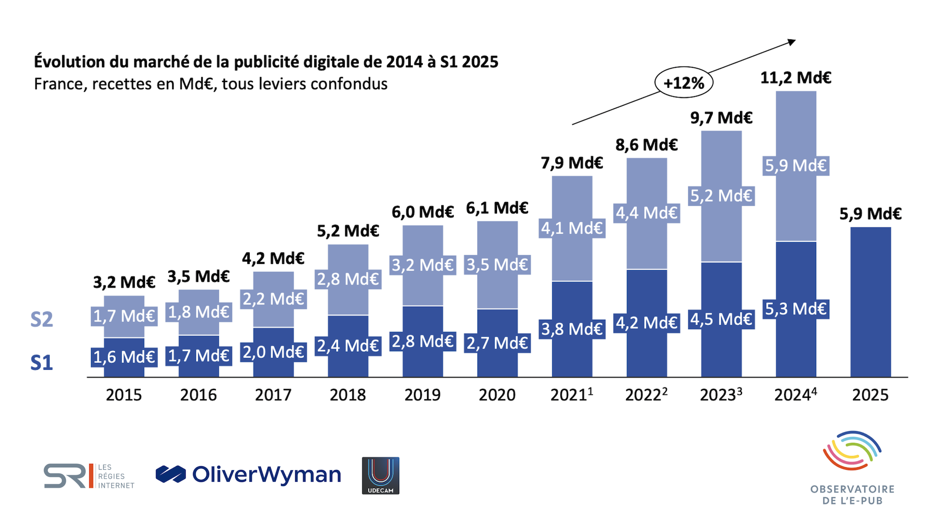 Le SRI et l’UDECAM ont publié le 34ème Observatoire de l’e-pub, réalisé par le cabinet Oliver Wyman et faisant étant d’une croissance de +11% du marché de la publicité digitale au premier semestre 2025 pour atteindre un chiffre d’affaires global de 5 911M€.