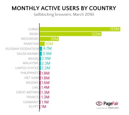 Le phénomène est davantage marqué en Chine, en Inde et en Indonésie, où le nombre de mobinautes faisant usage d'un bloqueur est respectivement de 159 millions, 122 millions et 38 millions.