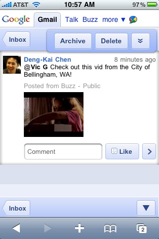 With the latest iteration of Gmail for mobile, we’ve worked to integrate buzz with your mobile inbox. Now, you’ll see buzz in your inbox on your phone just like you do in the desktop version of Gmail, complete with the little Google Buzz icon. When you open a buzz post from your inbox, you can perform all the standard functions, such as liking the post or commenting, just as you can from the desktop Gmail inbox.