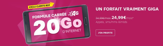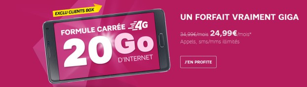 Cette offre concerne les clients équipés d'une boxe SFR (ADSL ou fibre), ou qui vont s’en offrir une avant le 30 juin prochain. Ceux-ci pourront bénéficier de la Formule Carrée 20 Go pour 24,99 EUR / mois (remise multipack de 10 euros incluse). Pas de mobile inclus, et un engagement d'un an est requis. Ce forfait coûte, seul, 34,99 EUR / mois.