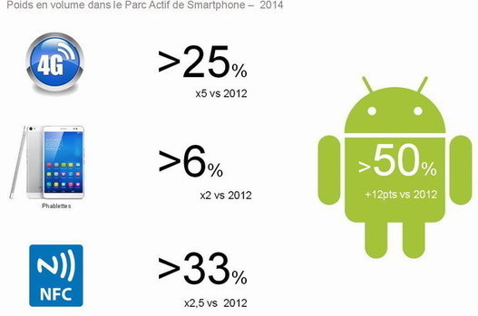 18,2 millions de smartphones ont été vendus en France en 2014 (+15% en un an). Ces terminaux représentent ainsi 76% des téléphones vendus. Plus de smartphones donc, mais aussi plus grands. Les 5 pouces ont fortement progressé.