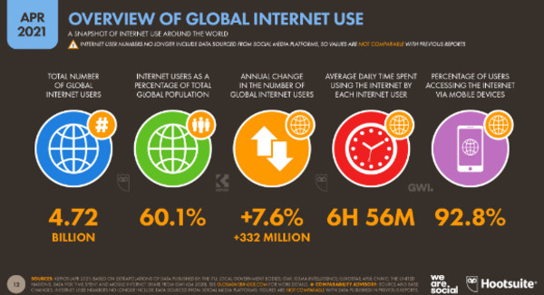 Selon le dernier rapport Hootsuite / We Are Social, 4,7 milliards de personnes dans le monde utilisent désormais internet, soit 332 millions d’utilisateurs en plus par rapport 2020 (+7,6 %)....